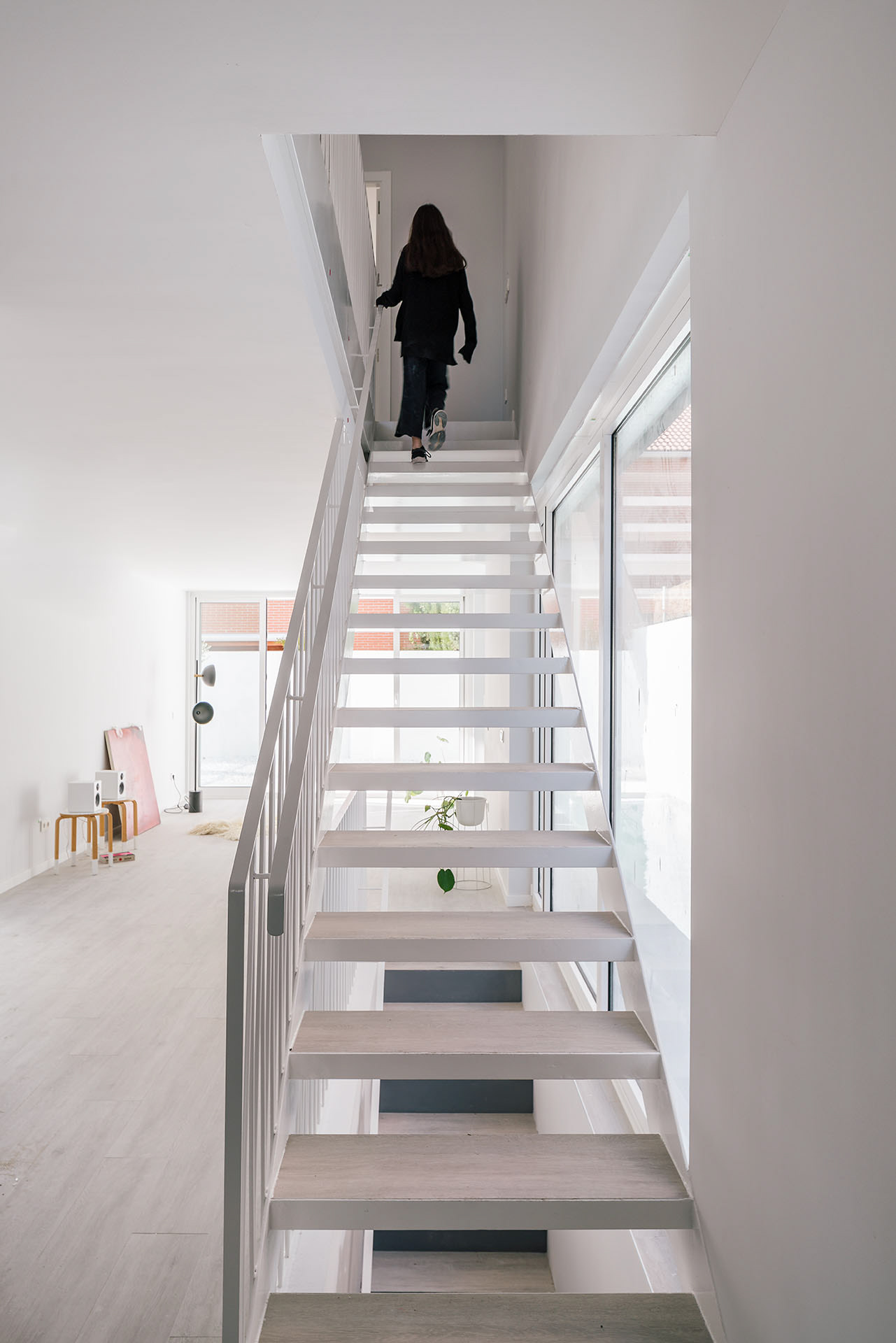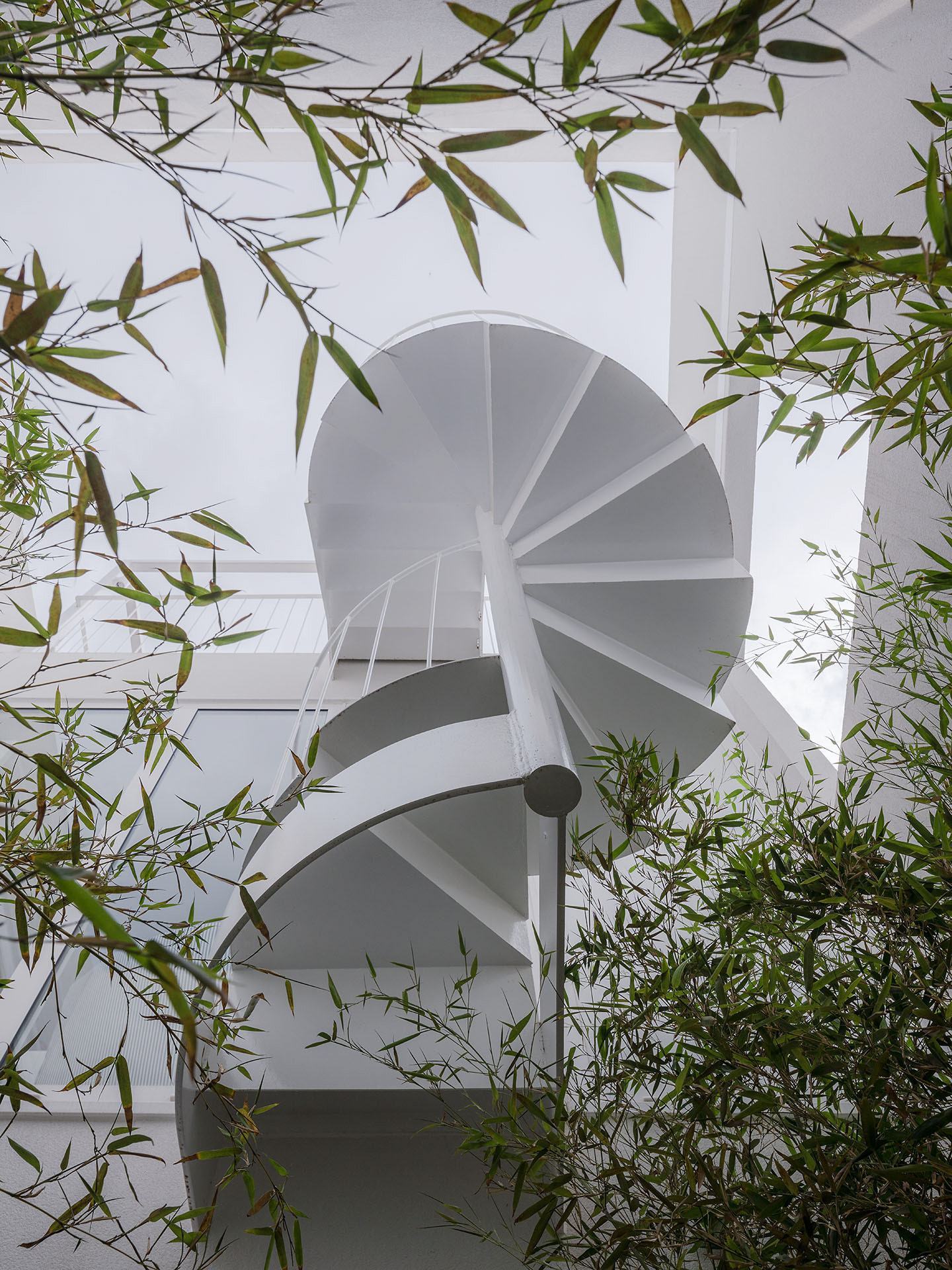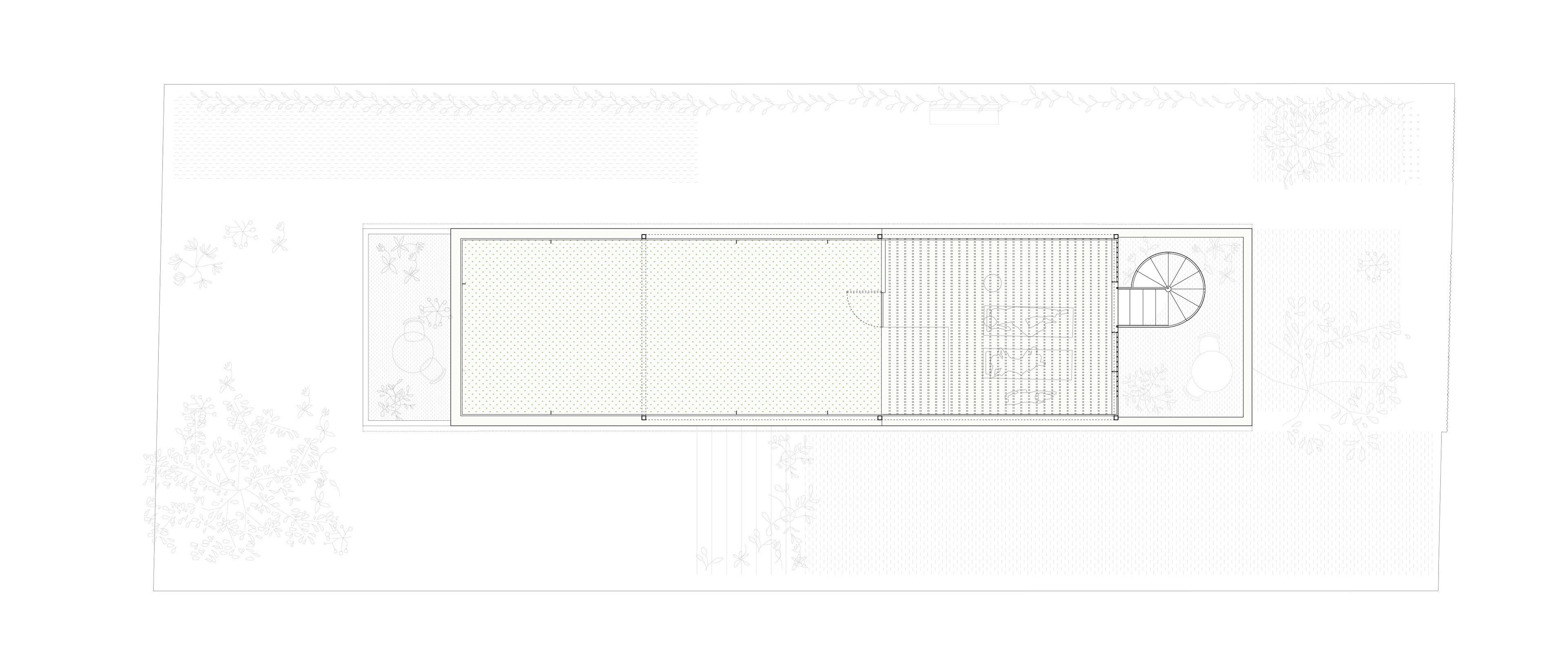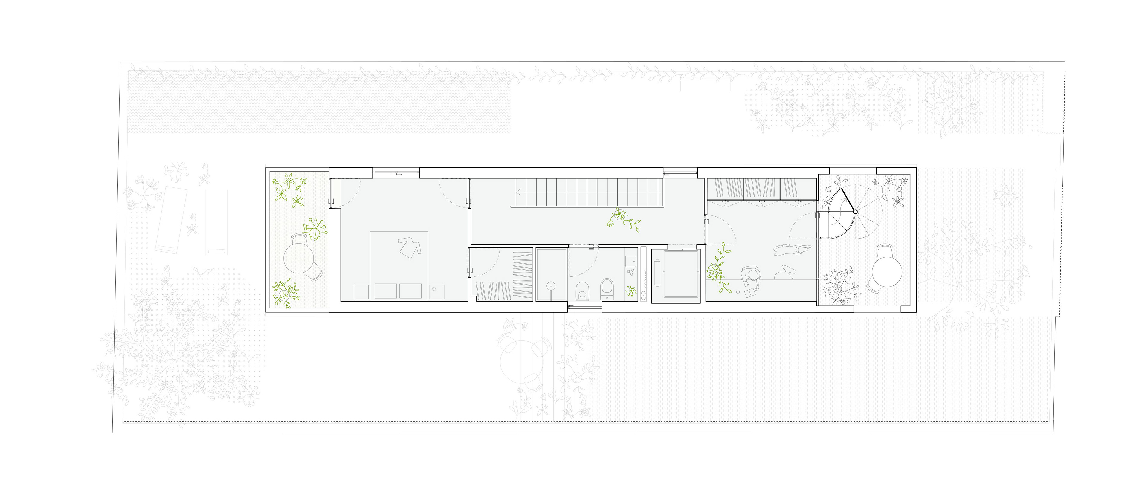 Second floor. Guest bedroom and studio. Connection to rooftop through spiral stair over terrace