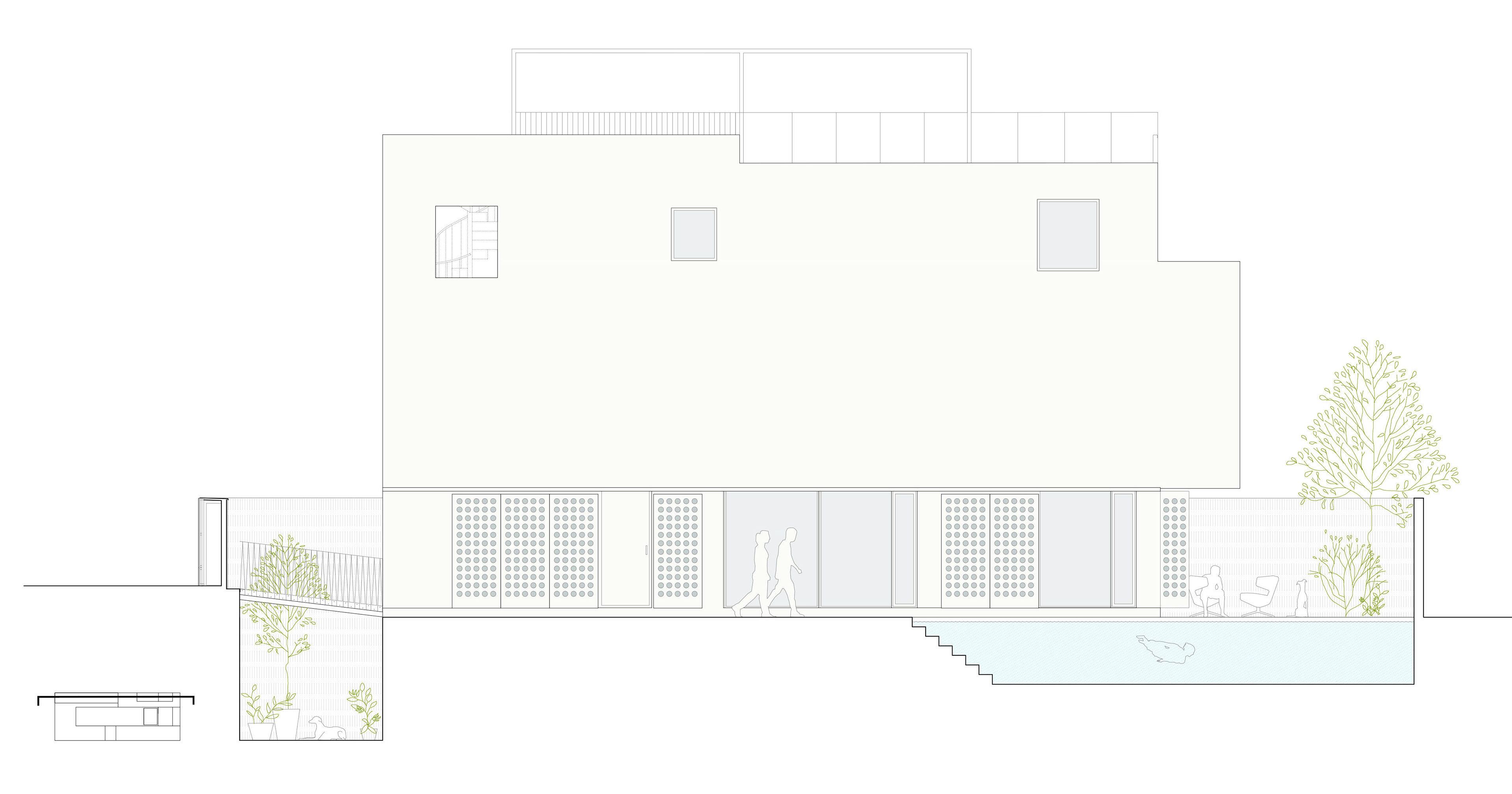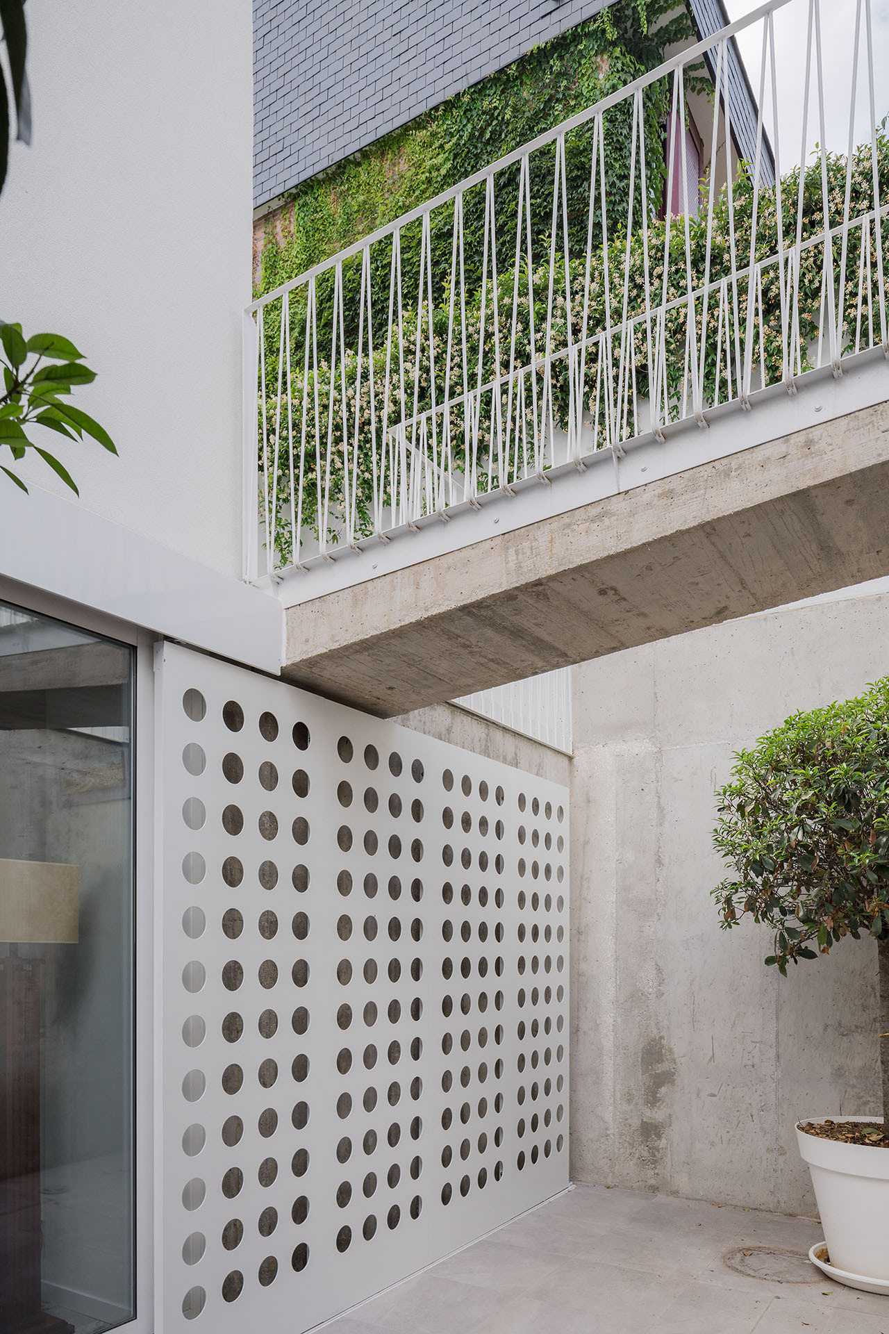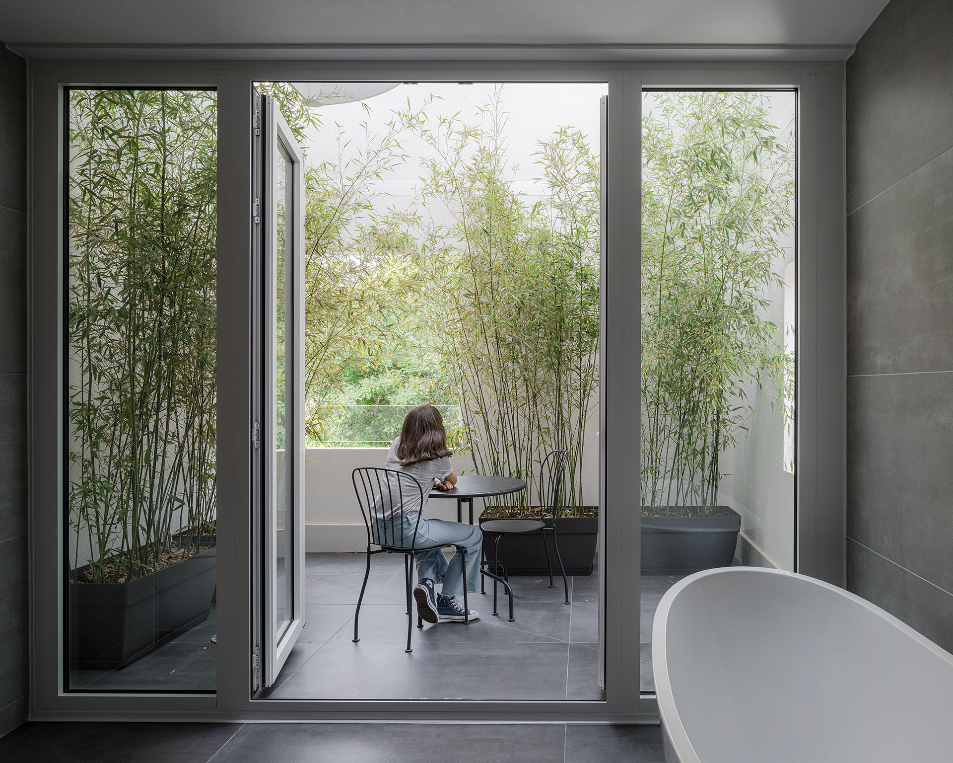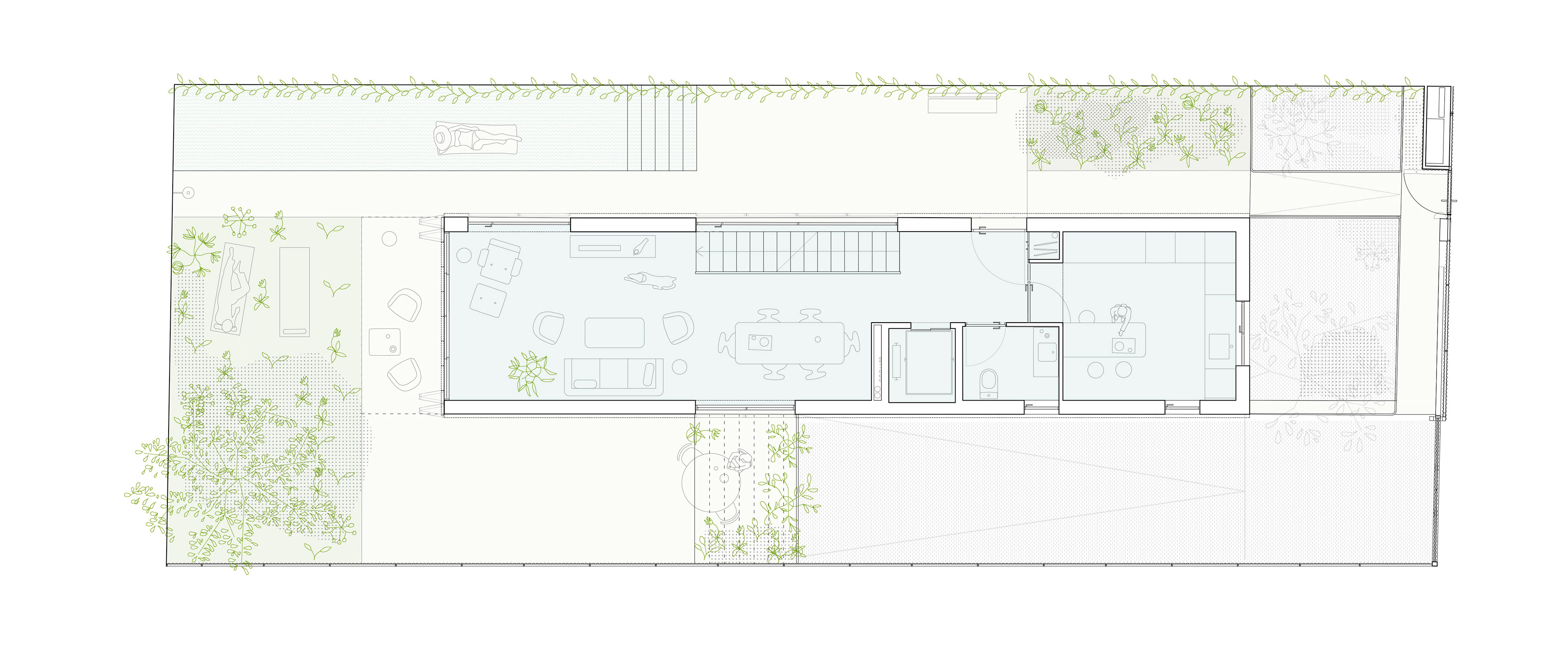 Second floor. Guest bedroom and studio. Connection to rooftop through spiral stair over terrace
