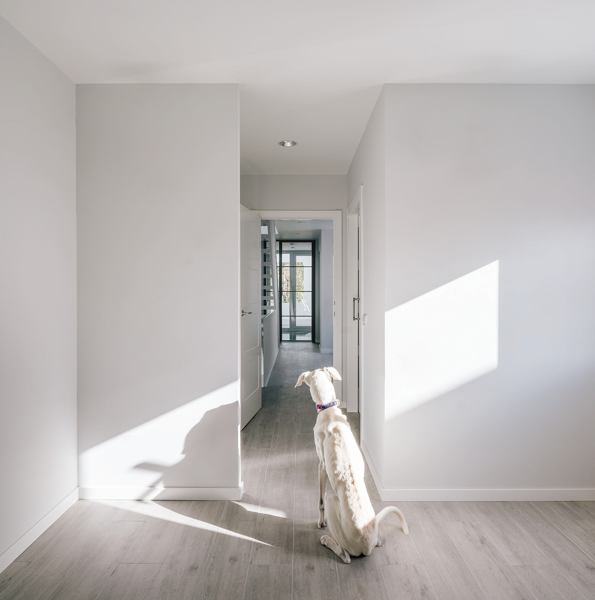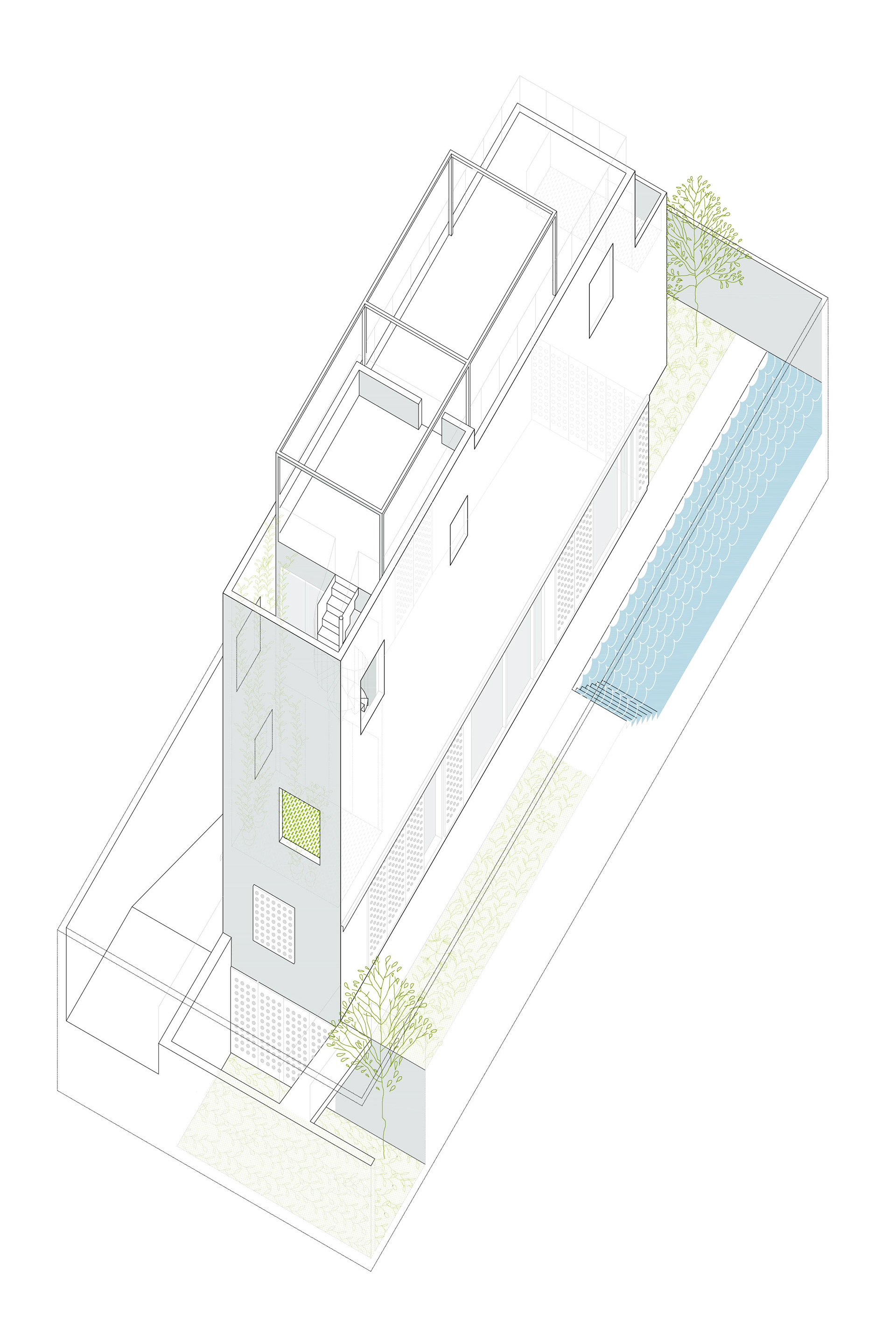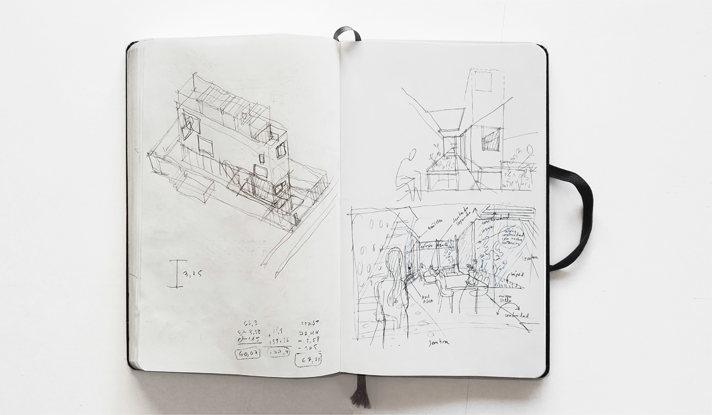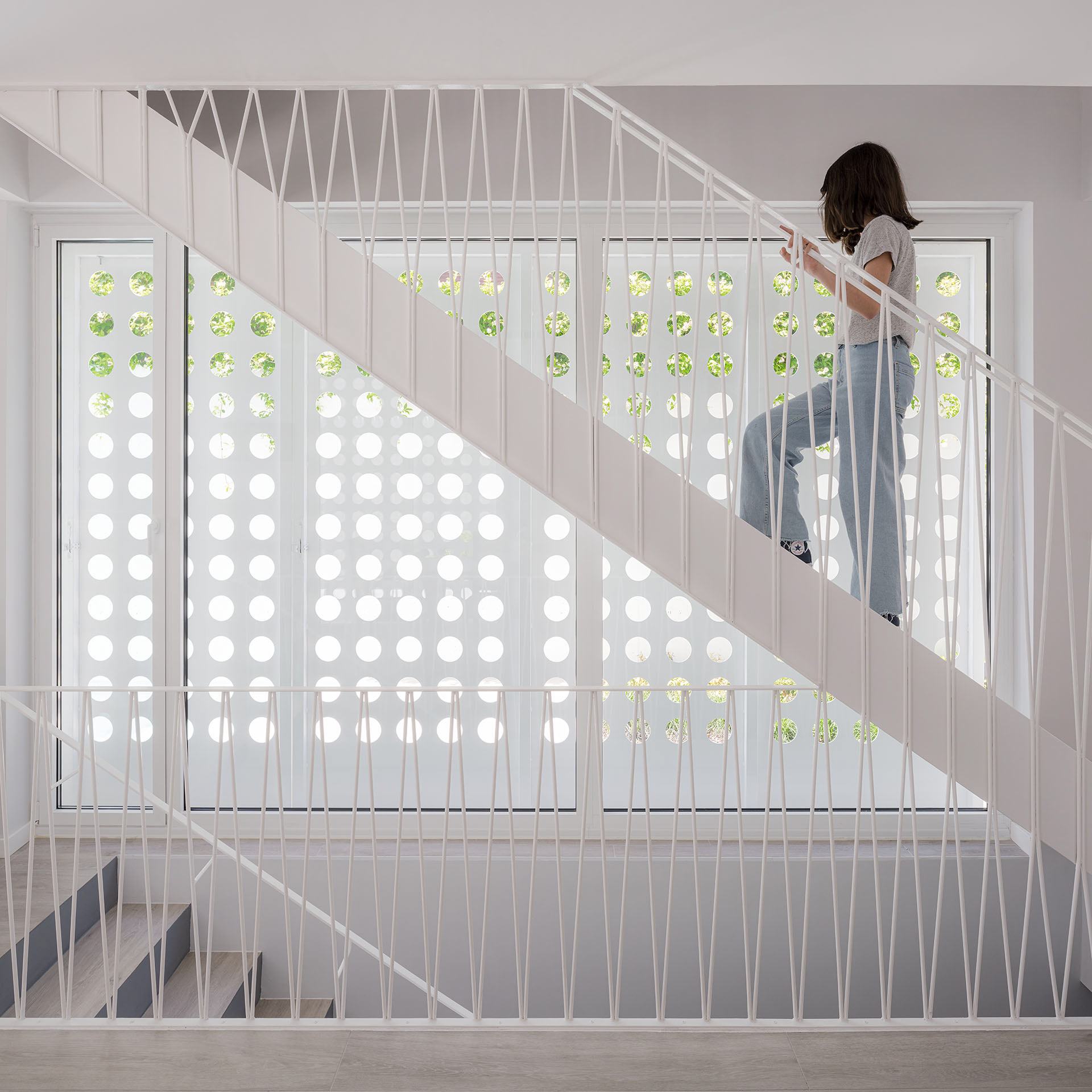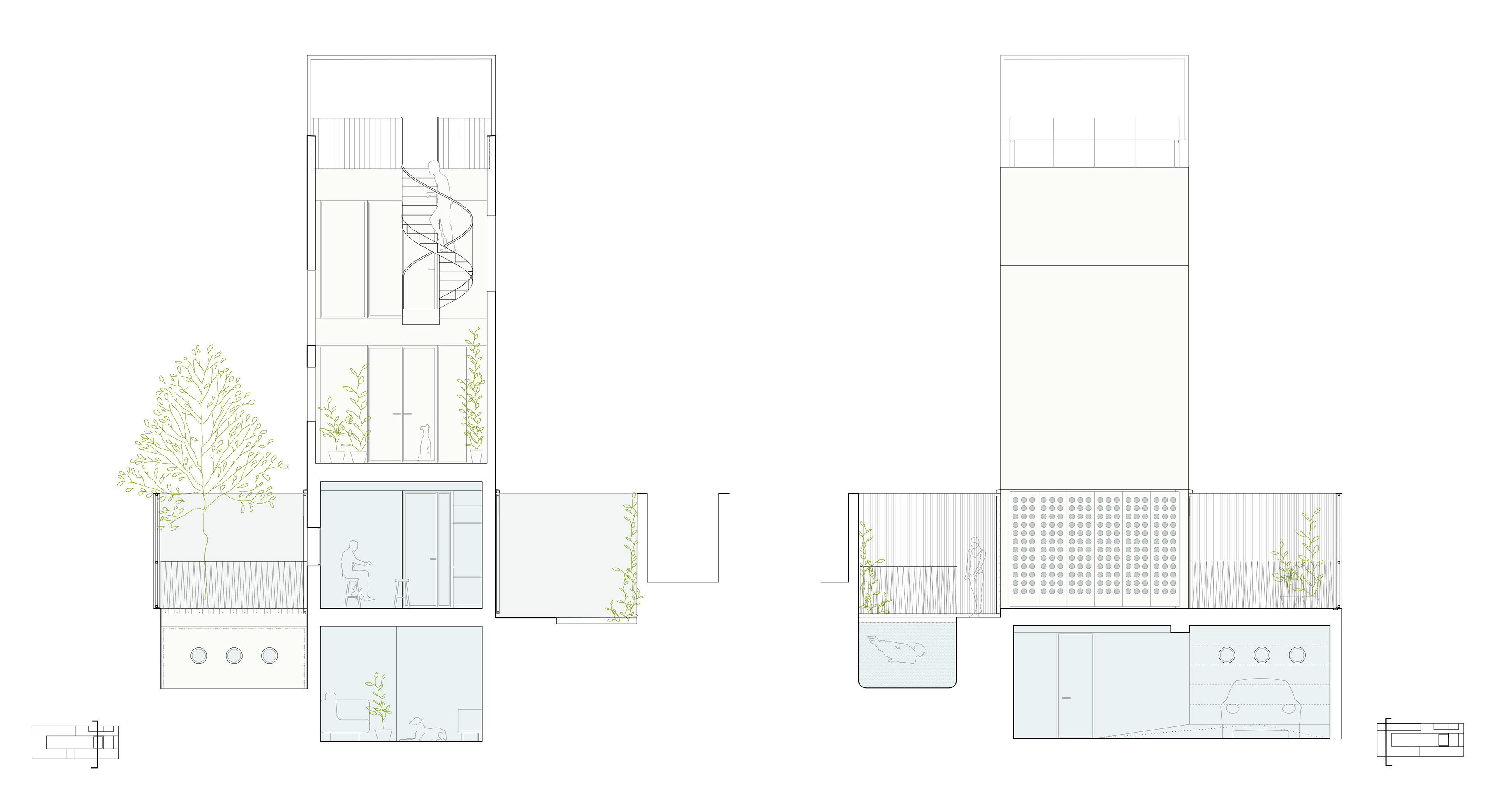 Second floor. Guest bedroom and studio. Connection to rooftop through spiral stair over terrace