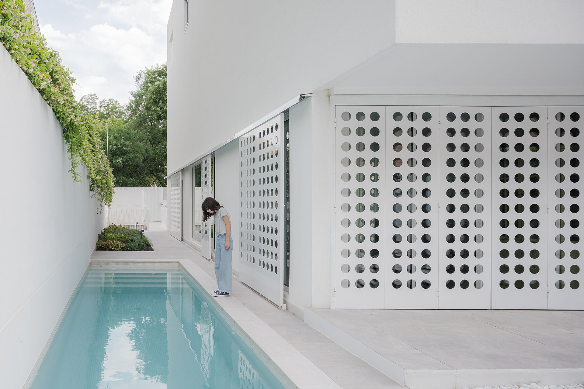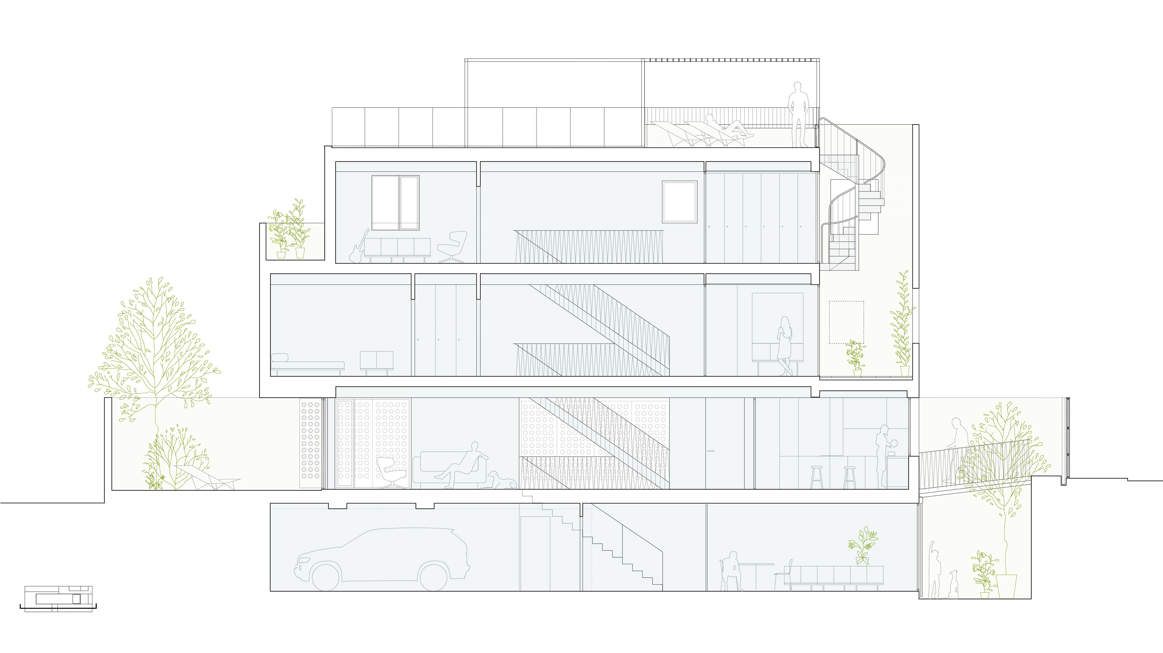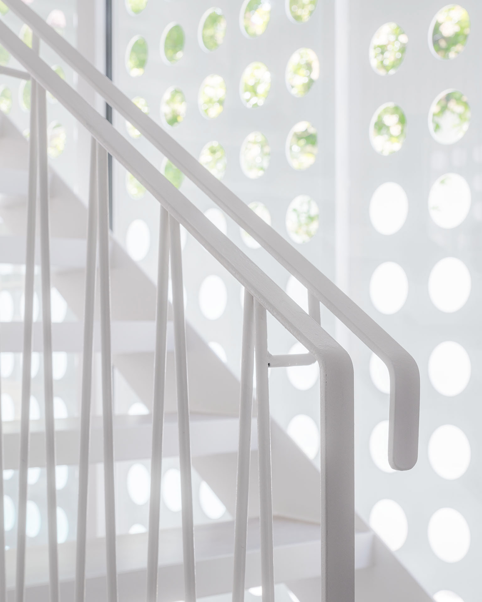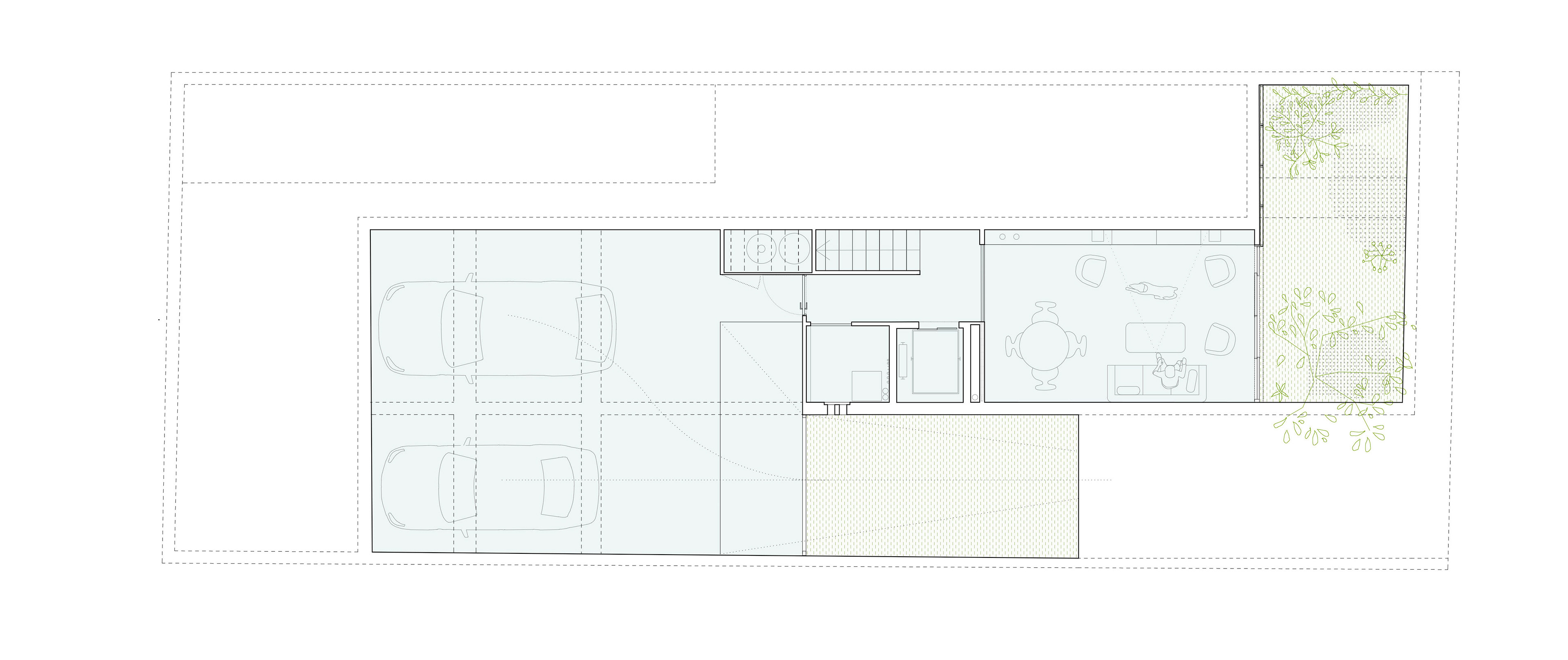 Second floor. Guest bedroom and studio. Connection to rooftop through spiral stair over terrace