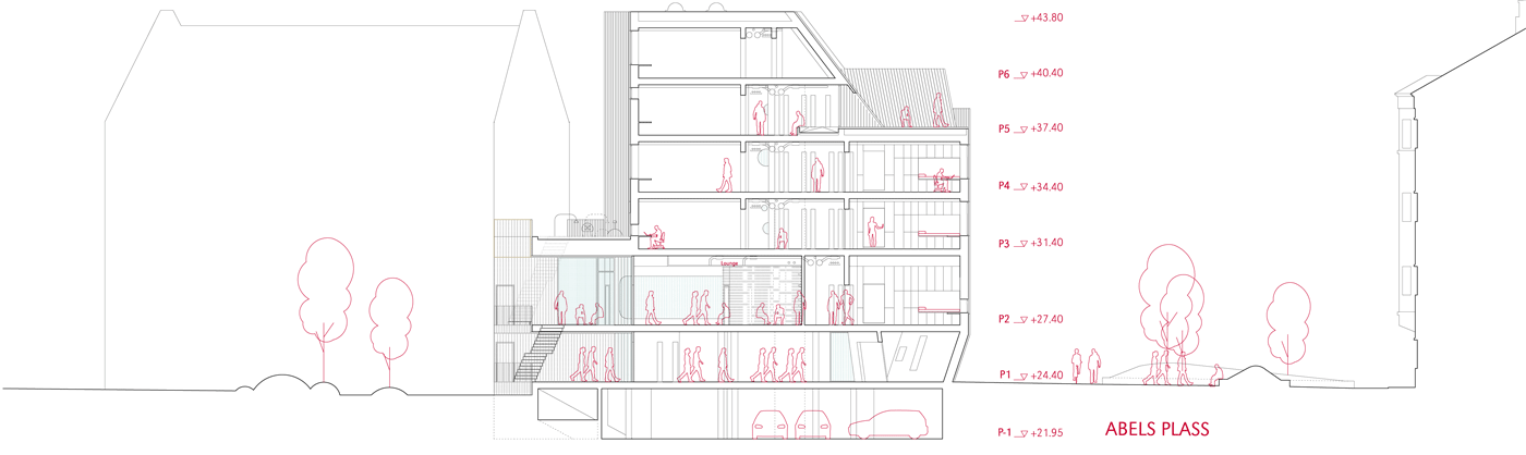 As a result of a special regulation that considers Elgesetergate as a road instead a street, no windows for rooms are allowed to be opened on that elevation. The front and the rear are thus conceived as thick containing membranes, while only corridors and lounge are able to look over the street.